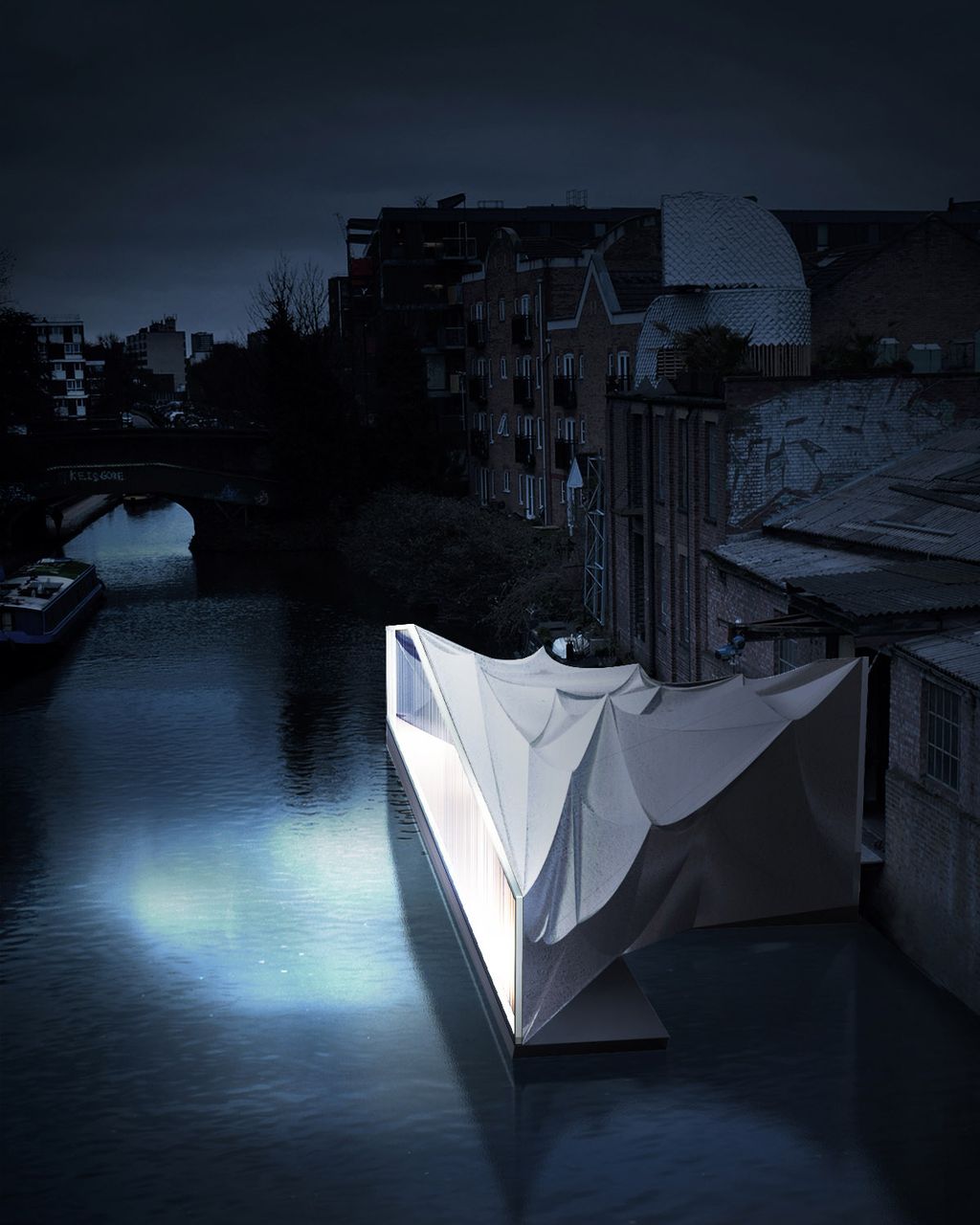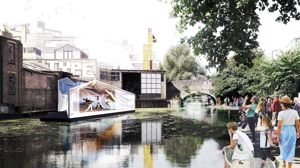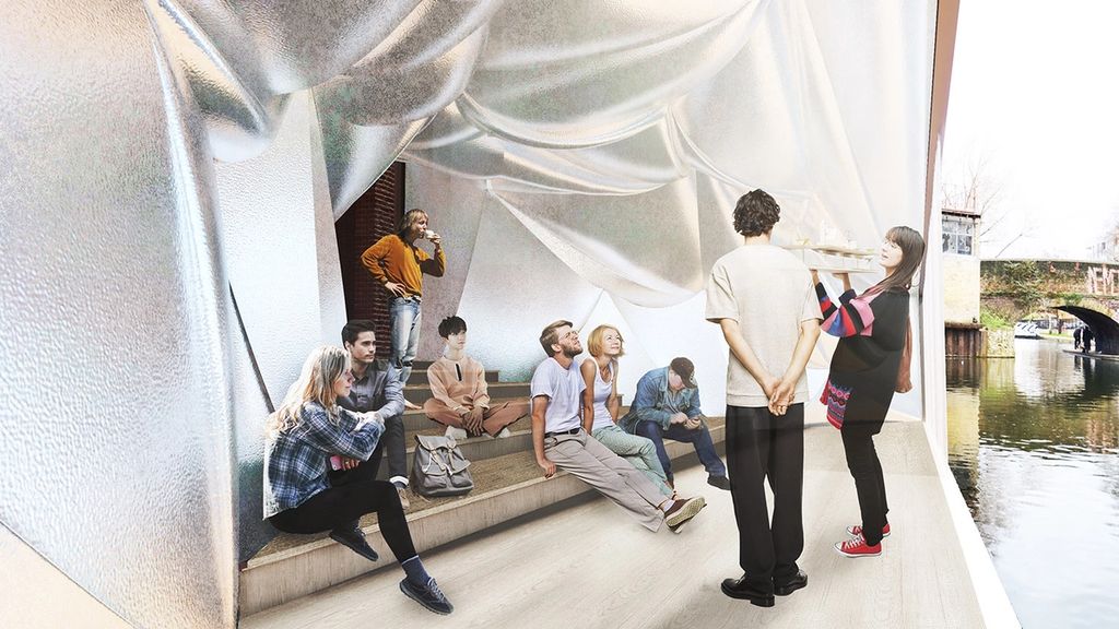 Regent’s Playhouse is a pavilion of a stage where the various activities take in place that intends to create communications across the canal. To realise large space with light material, the pavilion uses tarpaulin for its main architectural material which is hung and hoisted only by two structural frames installed on the edges of pontoons. There is a difference in size between the frames which enables the structures to pull and hoist the tarpaulin with wires to create tensions. Regent's Playhouse is a competition entry that seeks the idea to create a floating pavilion at Regent Canal located in the heart of east London.